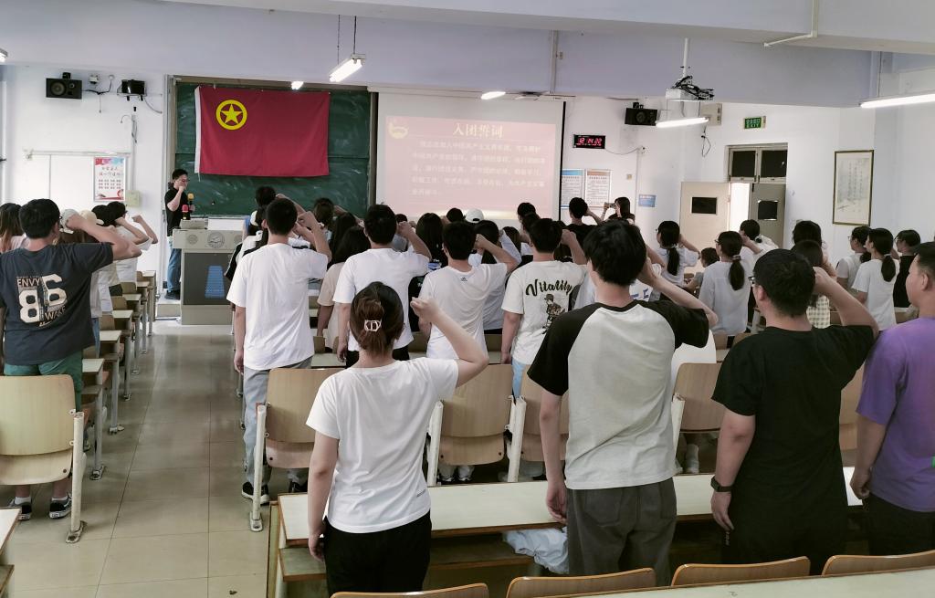 在领誓人的带领下,全体新团员面向团旗,高举右拳,庄严宣誓。“我志愿加入中国共产主义青年团……”铿锵有力的誓言回荡在教室中,表达了新团员们对共青团的无限向往和为团组织增光添彩的坚定决心。入团介绍人代表宣读了《中国共产主义青年团章程》中有关团员的义务和权利的条款,让新团员们明确了自身的责任与使命。
